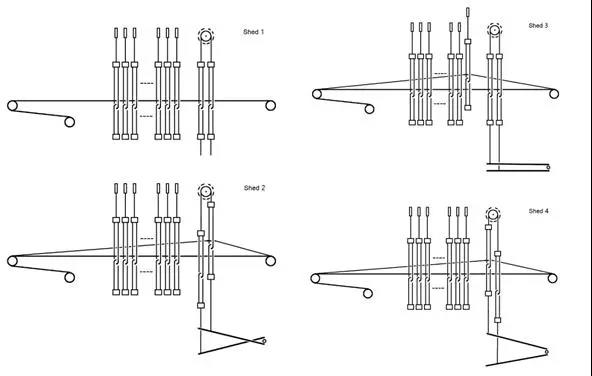 為了將經(jīng)緯兩個(gè)系統(tǒng)的絲線交織成為一件織物,通過(guò)綜線將經(jīng)線按照織物組織規(guī)律分開(kāi)成為上下兩層,形成梭口,這個(gè)就是開(kāi)口。再將緯線織入梭口,并打緊緯線,完成一次織造運(yùn)動(dòng)。