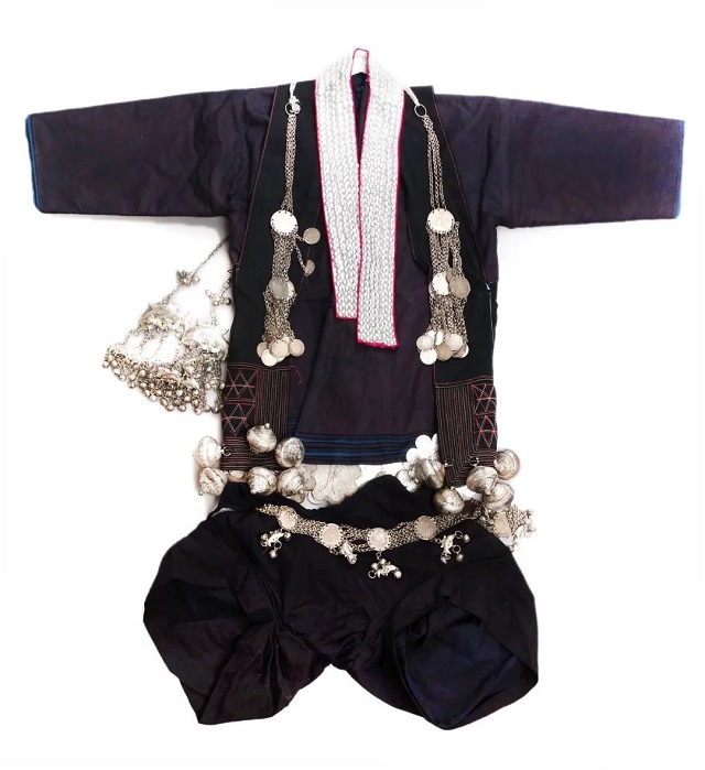此套哈尼奕車女青年套裝征集于紅河州紅河縣大羊街鄉(xiāng)妥垤村,現(xiàn)收藏于紅河州博物館,由白布尖頂軟帽、上衣、短褲、銀飾等11件組成,其中靛青色多層對(duì)襟無(wú)領(lǐng)短上衣,寬袖至肘部,白色布衣領(lǐng)鑲飾紅色邊,對(duì)襟兩邊釘銀泡,衣后背下端繡幾何紋。胸前佩戴銀鏈、銀魚等銀飾,上衣下擺兩側(cè)各釘6個(gè)銀螺和若干銀花片,腰系銀鏈。褲腰前后釘4股細(xì)麻線繩,起到褲帶的作用,下穿黑色打褶短褲。