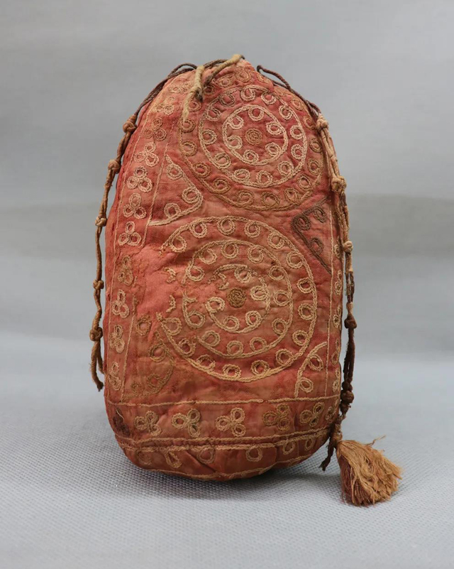 紅地刺繡圓珠紋綾袋,形制略呈橢圓形,紅色暗花綾為地,以黃、棕兩色繡線繡出兩條直線長方形邊框,直線內(nèi)繡有三瓣小花,邊框內(nèi)再繡有豎排三層聯(lián)珠圓環(huán)兩個,圓環(huán)外面空間為三角聯(lián)珠紋,袋子底部繡以四層圓珠環(huán)裝飾。針法為鎖繡。袋口有編結(jié)的紅色線繩用以抽系,繩帶端有一穗。圖案簡樸,色彩鮮艷。