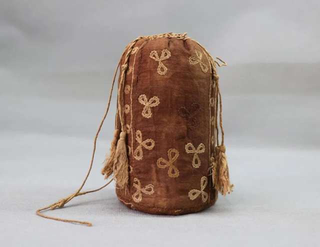 褐地刺繡花卉綾袋,呈圓柱形,以褐色菱格紋暗花綾為地,用黃色繡線以鎖繡繡出三瓣小花,中間和底部再用鎖繡繡出直線和圓珠作裝飾。袋口有四根黃色線繩,可用以抽系,繩的兩端綴有四穗。