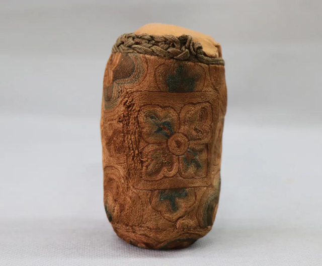 褐地刺繡花卉紋囊袋,袋身通體以黃、褐、藍(lán)色絲線采用劈針針法繡制。劈針屬于接針的一種,在刺繡時后一針從前一針繡線的中間穿出再前行。繡袋通體針線緊密,圖案先用褐色線繡出底紋,再以綠色、暗紅色等繡線繡出方形框,在方形框內(nèi)填以四瓣花卉紋,方框外以唐草紋裝飾。袋口用綠色繩帶編織而成,富有裝飾性。整體色調(diào)由淺至深,呈現(xiàn)出紋樣的立體感。