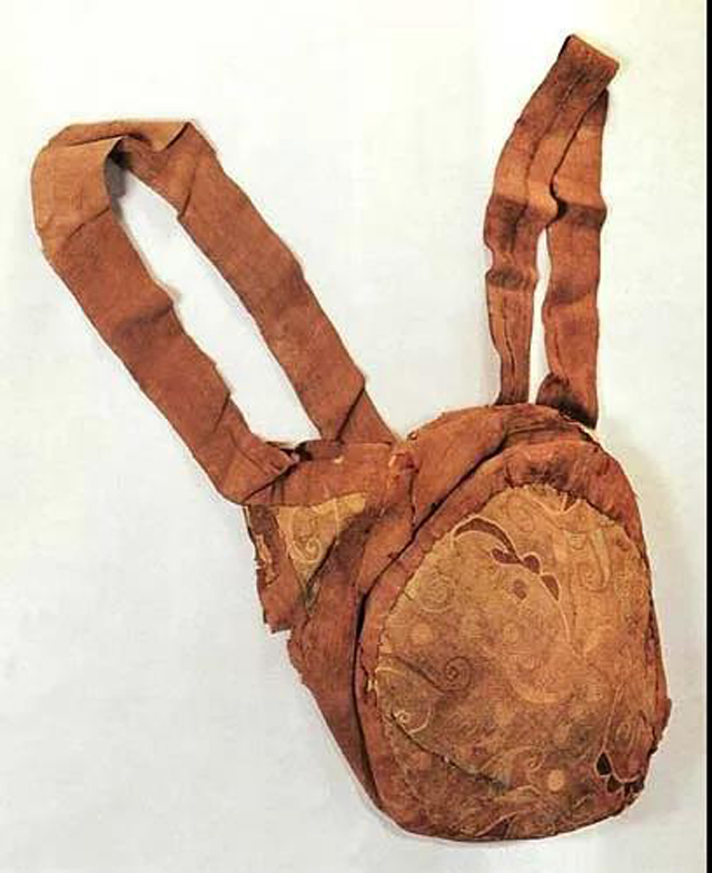 “袋”為衣兜或用布、皮等做成的盛東西的器物。原始社會采用天然材料當(dāng)做包袋使用。商周時期佩囊開始普遍,囊袋采用皮革縫制,因此也叫鞶囊。新疆鄯善蘇巴什葉古墓出土的鞶囊以羊皮制成,囊口開敞,綴有皮帶,便于栓掛。漢代囊袋的形式豐富多樣,并有各種不同的稱謂,盛放帛書的為“騰囊”,盛放印綬的為“綬囊”,盛放文書的為“書囊”,盛放香料的為“薰囊”,并且在漢代的的日用品中香囊、梳妝袋多了起來。1984年新疆洛浦縣山普拉墓葬出土的淺緣絹刺繡花草紋鏡袋,用錦片、綺條拼接縫綴而成,內(nèi)襯毛布,周邊鑲以紅絹,打開后呈橢圓形,表面用較粗的線繡出折線組成的網(wǎng)格紋,一邊裝有一面小銅鏡,另一邊裝有木梳,用時打開,用畢折合,還附有提袋,以便佩掛。類似的梳妝袋在民豐縣尼雅址的東漢墓葬也有發(fā)現(xiàn)。香囊以湖南長沙馬王堆一號漢墓所出的四件較為典型,分別為信期繡綺香囊、信期繡羅綺香囊、香色羅綺香囊、信期繡絹香囊,形式大體相同。