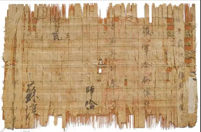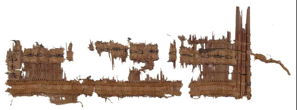 該經(jīng)帙長(zhǎng)36.1cm,寬27.8cm,由深藍(lán)、淡藍(lán)、綠色、米色、金黃色、棕色絲線(xiàn)組成,4寬5窄共9條帶狀編織圖案相間排列,寬度在0.7cm-2.2cm不等,經(jīng)向絲線(xiàn)密度約為22根/cm,呈Z捻向,緯向竹篾密度約12根/cm。竹篾呈紅褐色,共計(jì)336根,每根長(zhǎng)度約27.8cm,斷裂嚴(yán)重,圖案辨認(rèn)困難,基本可判斷是散點(diǎn)幾何紋。這是由一些形狀不一的小型幾何紋樣或瑣碎的點(diǎn)狀紋樣排列而成的,相近顏色編織時(shí)采用暈??的手法過(guò)渡。該經(jīng)帙有兩邊還保留著包邊,保存較好的一邊為中亞風(fēng)格的斜紋緯錦,但在其后接了一段另一種以紅綠色為主的斜紋經(jīng)錦。因此可推測(cè),這件經(jīng)帙的兩短一長(zhǎng)三條邊上都以花卉紋經(jīng)錦包裹,而一條長(zhǎng)邊由緯錦和其他經(jīng)錦補(bǔ)缺。且因經(jīng)錦覆蓋在緯錦上,可推測(cè)此經(jīng)帙原本以緯錦為緣,破損后縫補(bǔ)上經(jīng)錦。錦緣花卉紋絞編經(jīng)帙的背面原來(lái)應(yīng)該粘有一份文書(shū),現(xiàn)已破損,僅留有邊緣,字跡難以辨認(rèn)。但上有正反所書(shū)文字,較為雜亂,是由多份文書(shū)合拼而成(如圖6)。