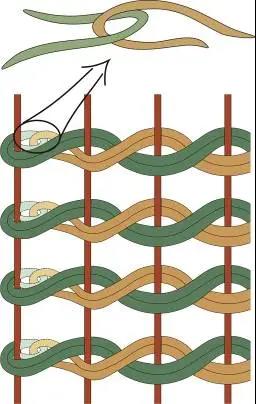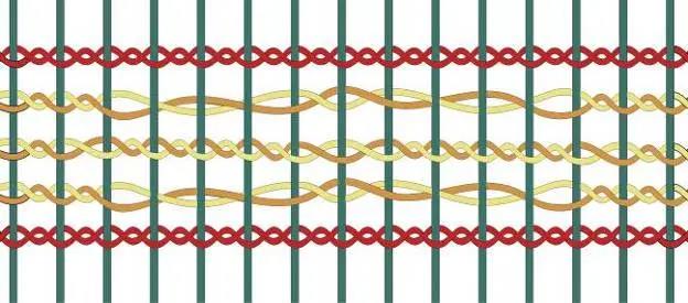 這些竹帙在編織時(shí),采用平鋪式從左往右依次推進(jìn),并利用針等工具,使絲線(xiàn)穿過(guò)竹篾進(jìn)行編織。采用環(huán)扣式起頭,指將兩根異色絲線(xiàn)對(duì)折后相扣在一起,采用這種方式起頭最牢固,并且背面效果最為簡(jiǎn)潔和利落(如圖4)。