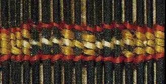 經(jīng)帙的文字部分是編織在一個(gè)長(zhǎng)方形的框中的,絲線(xiàn)并未像其他經(jīng)帙一樣從左至右通幅編織,而是編織完一行后反方向從右至左順時(shí)針繼續(xù)編織(如圖11)。另外,該長(zhǎng)方形框中使用的絲線(xiàn)密度與編幾何圖案時(shí)的絲線(xiàn)密度是不同的,長(zhǎng)方形框使用的絲線(xiàn)更細(xì)。編織幾何圖案時(shí)相當(dāng)于重新起頭,其一部分與長(zhǎng)方形框結(jié)合,起到固定作用,編織方式不變。