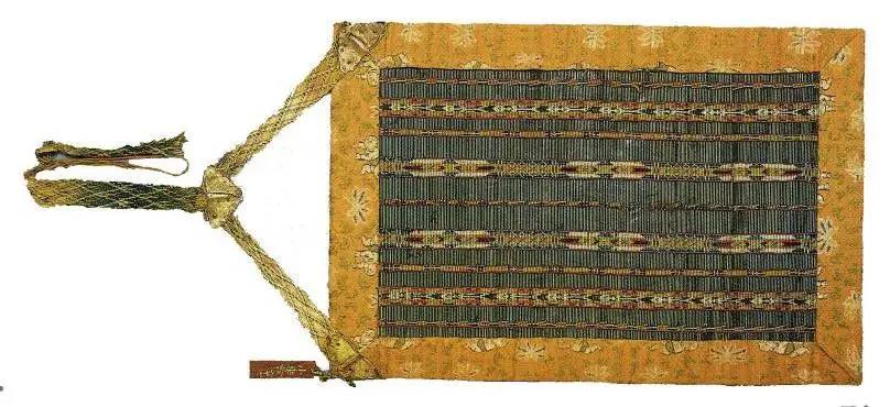 帙,書(shū)衣也,小囊也。[1] 經(jīng)帙,即古人用來(lái)包裹佛經(jīng)經(jīng)卷的物品,方便收藏。按制作材料的不同,經(jīng)帙一般可以分為織物編制、竹篾編制等種類(lèi)。其形態(tài)多樣,有的有系帶裝飾,有的則無(wú)帶,并且裝飾的方式又有多種,功能性則各有側(cè)重。竹制的經(jīng)帙一般包括織物、竹篾、絲線(xiàn)等多種材料,使用絞編技法編織而成。絞編技法是中國(guó)出現(xiàn)較早的手工編織方式之一,采用一組平行,一組相互絞轉(zhuǎn)的兩組絲線(xiàn)制作而成。這種竹編的帙在中國(guó)古代多有記載:南朝梁文學(xué)家蕭統(tǒng)《賦書(shū)帙》中曰:“幸雜緗囊用,聊因班女織?!?[2]陸游《入蜀記》第四:“白公嘗以文集留草堂,后屢亡逸,真宗皇帝嘗令崇文院寫(xiě)校,包以斑竹帙送寺?!盵3]