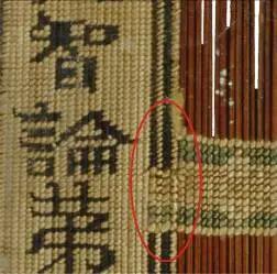 敦煌出土的絞編經(jīng)帙的編織技法大致是相同的,僅少數(shù)因編織了文字,產(chǎn)生區(qū)別,一是編織時(shí)模仿了毛筆字筆鋒的效果,在漢字的起筆和落筆處的編織有一定的特殊性,制作起來(lái)有難度,需要變動(dòng);二是這幾個(gè)字編織在一個(gè)長(zhǎng)方形的方框中,但并不是像一般竹帙編織時(shí)絲線(xiàn)從左至右通幅編織,而是在編字時(shí)絲線(xiàn)變換方向。