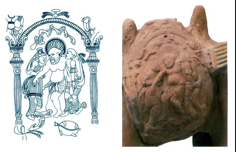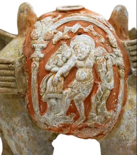 2006年,西安市文物保護(hù)考古研究院在西安長(zhǎng)安區(qū)郭杜鎮(zhèn)岔道口村南發(fā)掘清理了一座隋代夫婦合葬墓,因其位于陜西師范大學(xué)長(zhǎng)安校區(qū),被編號(hào)為陜師大M1,從墓志銘看,此為隋代集州刺史、汝南公張綝和夫人薛世蘭的合葬墓,此件陶駱駝俑即出土于此墓,由西安市文物保護(hù)考古研究院收藏。在駝囊的畫面之上,酒神狄俄尼索斯在兩旁人圍繞簇?fù)硐?,扶肩搭背,似乎剛從狂歡中退出來,側(cè)旁的男子隨從還手提鴨嘴胡瓶。特殊的是,酒神頭部背后有圓形頭光。頭頂背后有光環(huán),這是酒神與太陽神的混合特征,中亞這類形象極為常見,某些特征一直傳到了中國(guó)。駝囊側(cè)面頂部有頭顱高昂的武士,頭戴盔帽,身穿外套形的鎧甲,緊腰束帶,衣襟外展長(zhǎng)達(dá)膝蓋。葛承雍先生將此類駝囊稱為“醉拂菻駝囊”。