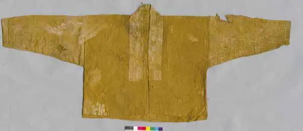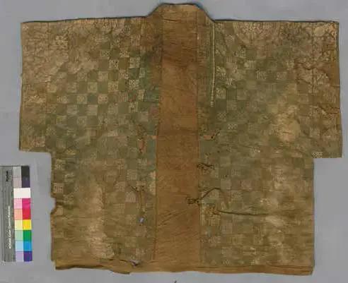 這兩件衣服原為一套,均采用了印金工藝,十分華麗。元代印金織物十分流行,與宋人將其主要用于衣襟處不同,元人已將其施于整件衣服。所用工藝包括銷金、泥金、貼金、鋪金、砑金等,基本上都以羅、綾等素織物為底料。其中最為重要的印金工藝是銷金,即先在織物上用凸版印上粘合劑,然后貼上金箔,經(jīng)烘干或熨壓,剔除處圖案部分外多余的金箔。圖案受限于印花版,多為稀疏的小型答子紋,偶見連續(xù)大型紋樣,此外還有在印金上加以彩色描繪或套色加印。