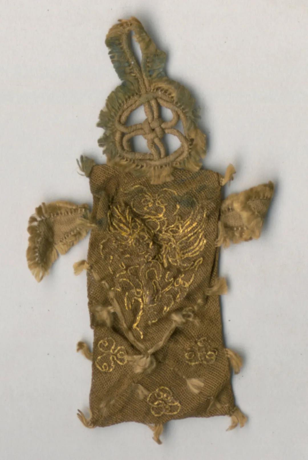 該件文物寬4.5 厘米,長13厘米。其上端用繩子編成環(huán)狀,內(nèi)系一同心結(jié),繩子外圈有穗狀裝飾一周(圖1) 。飾品主體為長方形囊袋,有袋蓋,其上用金線繡了一對(duì)交頸鴛鴦,頭部羽毛、交匯的脖頸,以及張開的翅膀清晰可見,但其下方的金屬繡線大部分已經(jīng)脫落。主體兩邊分別縫有兩片帶穗狀邊飾的三角形,在折邊處也有類似的穗狀裝飾,三根穗為一組。這種三根穗的裝飾形式在同地出土的其他文物中也有出現(xiàn)(圖2)。同心結(jié)的基本樣式自南北朝到隋唐再到兩宋,沒有多少變化,被廣泛運(yùn)用在佛教藝術(shù)中。