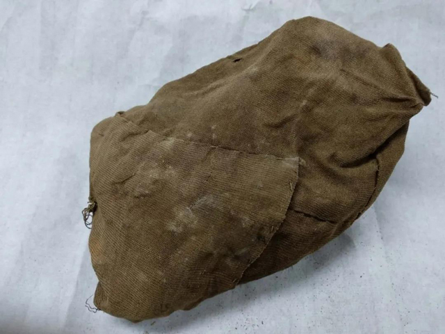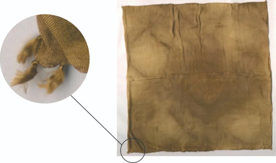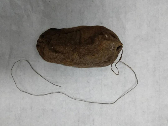 沉香袋用一塊長方形布料通過折疊、翻轉(zhuǎn)、縫合包裹而成,其外形與上述羅囊類似,兩端有縫線收口,也有塊狀香料在袋內(nèi),香氣濃郁,千年未散(圖14) 。