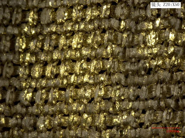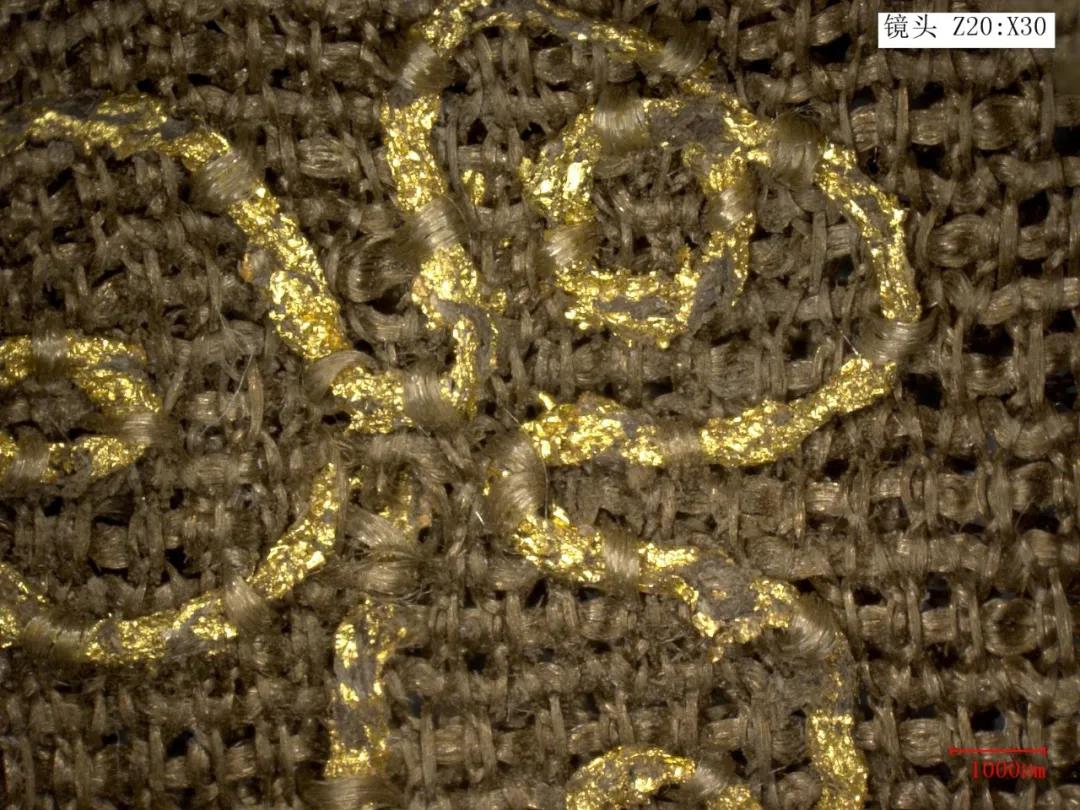 這件飾品主體采用四經(jīng)絞羅,上面縫有圓金線裝飾紋樣(圖3)。羅織物在當(dāng)時(shí)并非常人所能服用,且又加縫金屬線裝飾,這些都說明當(dāng)時(shí)使用的人具有一定的地位和財(cái)富。