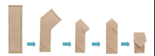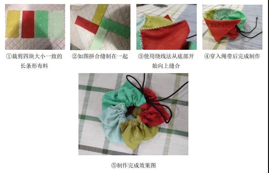 其制作方式也較為特別,是由一塊長方形的布旋轉(zhuǎn)折疊而成。其折疊方式示意如圖4,主體制作完成后,再縫綴金屬線及同心結(jié)等裝飾。此囊袋較小較平,只適合放一些輕薄小物,因其香氣撲鼻,猜測可能曾用于存放香料。