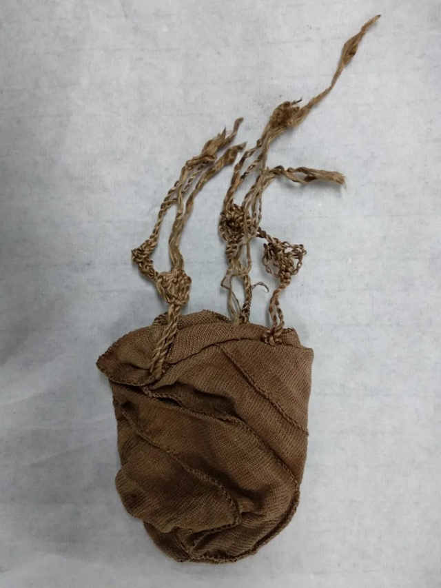 羅囊為圓筒形囊袋,羅組織,高8厘米,直徑約4.5 厘米,繩長31厘米,兩端縫線抽緊可收口,束口處的長繩可能為掛串之所用(圖13) 。囊袋內(nèi)還保存有塊狀物品,氣味香濃,猜測為某種香料。