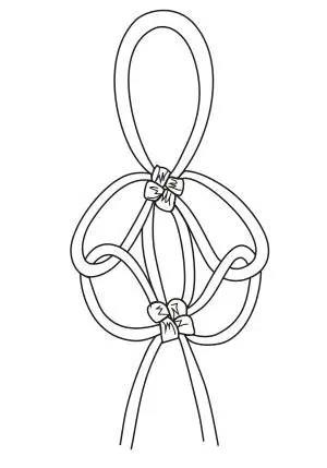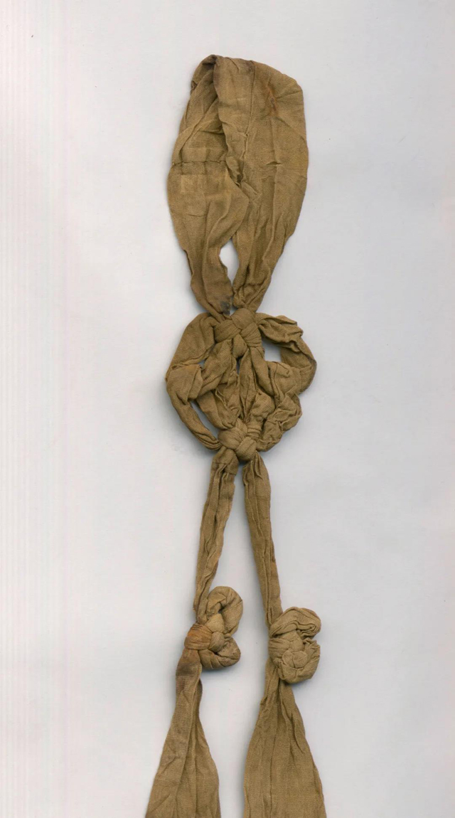 此文物制作工藝獨(dú)特,巧妙精細(xì),與一般的平面囊袋不一樣。該囊底與囊身面料呈一體,螺旋狀上升,且有明顯的裝飾縫線,凸起拼縫。根據(jù)該囊袋特征及殘剩局部特點(diǎn),通過分析研究,發(fā)現(xiàn)其是由四片長方形布料從底部拼縫后再斜向上翻,使用明線在拼縫處繞針縫合,到上端袋口處,自然形成四個(gè)尖角,外翻形成柿蒂狀囊口(圖6)。囊袋口處有四個(gè)環(huán)形扣,分別裝飾四條繩帶,繩帶上有編結(jié)且編結(jié)方式也頗有特色,為雙結(jié)聯(lián)合環(huán)套(圖7) 。這種打結(jié)方式在同地出土的另一件文物打結(jié)素羅絲帶(文物號(hào)17-1) 中也有出現(xiàn)(圖8)。除裝飾繩帶以外,其袋口一圈似有縫線,根據(jù)其形制及使用功能推測,可能是起束口作用,但現(xiàn)已斷落。