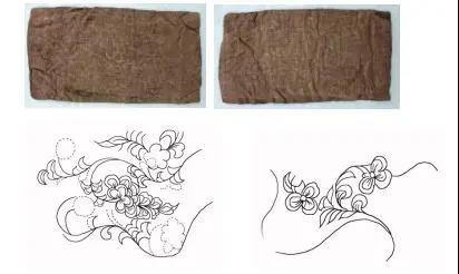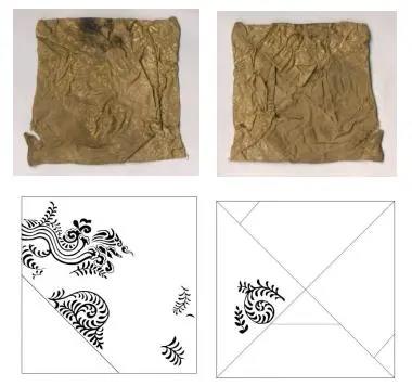 類似的囊袋還有一件泥金羅囊(文物號(hào)27) ,是邊長為18.5 厘米的近似正方形的囊袋,同樣是使用描金的方法,在其上繪制了卷草紋樣,但因其褶皺較深且金箔多有脫落,紋樣僅能部分識(shí)別。泥金羅囊的文物圖及紋樣復(fù)原圖如圖12所示。