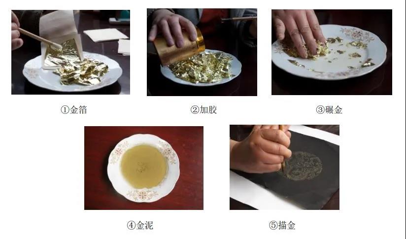 第一件文物紅羅地描金卷草紋夾袋為長方形囊袋,羅組織,款式簡潔,雙面均用金粉描繪出卷草紋樣,線條流暢,畫面飽滿(圖9、圖10) 。這種描金工藝在大報(bào)恩寺遺址地宮出土的文物中多有體現(xiàn)。該技術(shù)是先將金箔紙加膠黏劑后不斷碾壓研磨成金泥,再用毛筆將紋樣描繪在紡織品上(圖11) ,既可以大面積涂抹,又可以描繪細(xì)部,是一種應(yīng)用廣泛的飾金方式。
