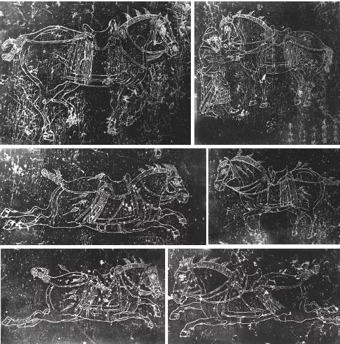 北宋元祐四年(1089),為“便觀覽”“廣其傳”,時(shí)任陜西轉(zhuǎn)運(yùn)判官的游師雄命醴泉知縣呂由圣在邑城西門外太宗廟立《昭陵六駿碑》。碑額篆題“昭陵六駿”,碑面上段為游師雄題記,記述刻石原由;下段為按比例縮小的六駿線刻畫及照錄的馬贊、馬名和立功事跡。宋代金石學(xué)的興盛及唐代以來逐漸成熟的拓印技術(shù),使六駿圖像擺脫原初的祭祀場所,以拓片的形式加快了傳播的速度和廣度,成為一種象征的意象符號,延伸到不同藝術(shù)領(lǐng)域,成為新創(chuàng)作的源泉。