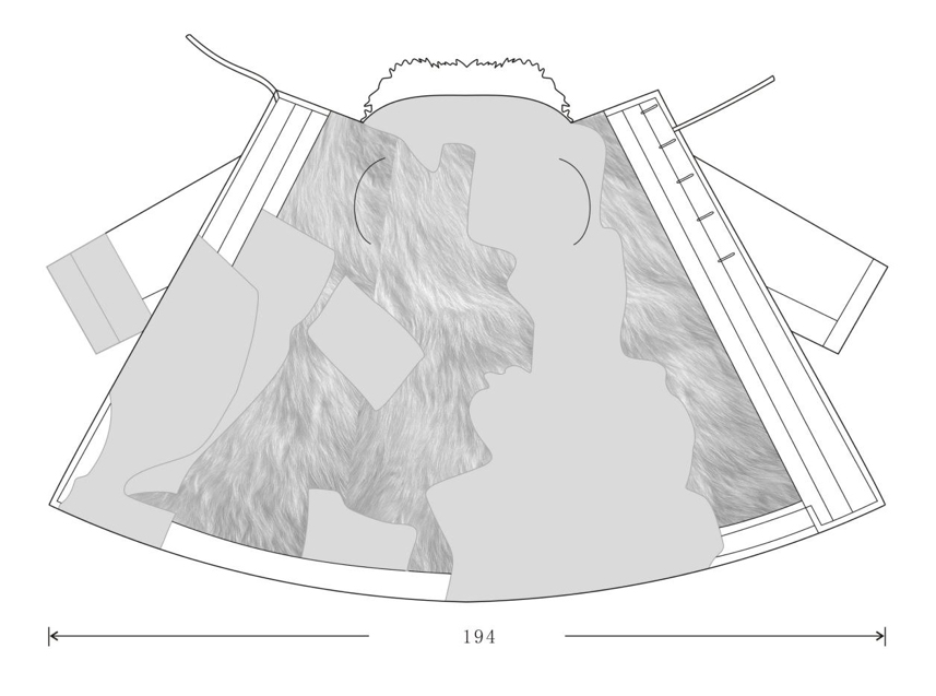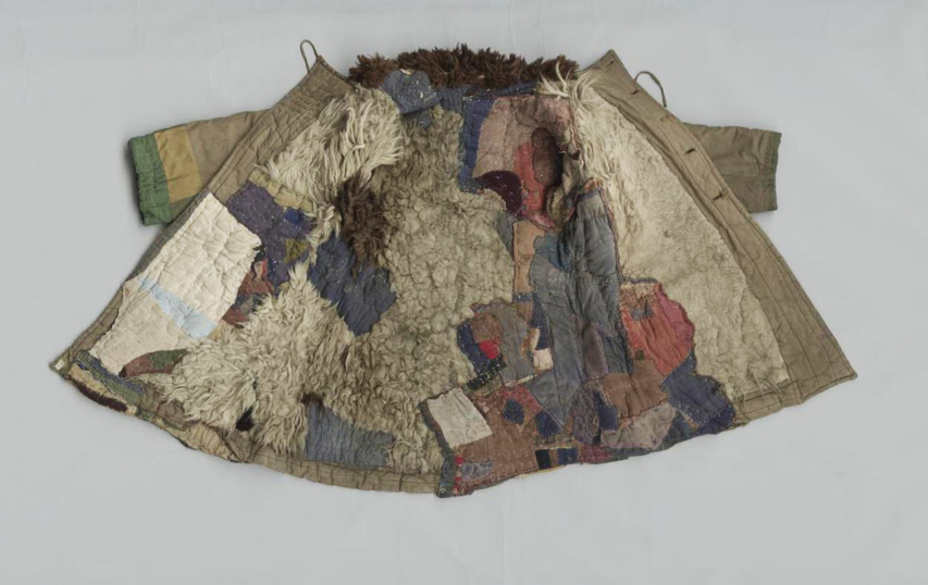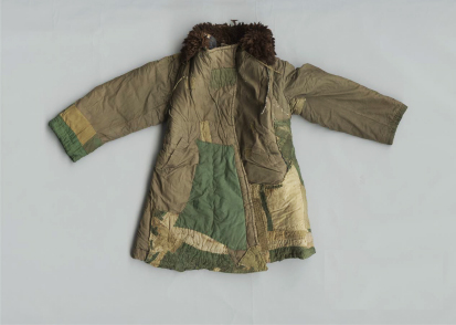 此件軍大衣主體為軍綠斜紋布及羊皮毛縫制而成,單排扣,斜插口袋,毛領(lǐng)。大衣經(jīng)縫補(bǔ)后十分厚重,袖子處幾乎無(wú)法折疊,里外均有多層的補(bǔ)丁。尤其是內(nèi)部,還有羊毛補(bǔ)丁,因?yàn)殚L(zhǎng)期的穿著,羊毛已經(jīng)有磨損及污染。