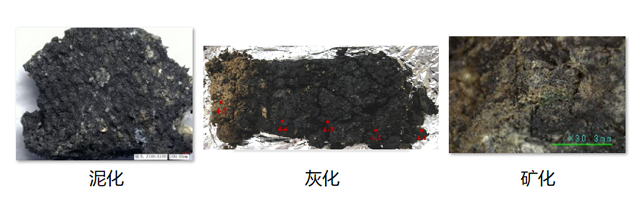 絲綢屬于蛋白質(zhì),在埋藏過程中極易降解,加之三星堆出土文物大多有燒灼痕跡,燃燒和高溫對絲綢的保存非常不利,同時,絲綢殘留物和坑內(nèi)的灰燼、泥土、各種器物混雜在一起,給尋找絲綢帶來巨大挑戰(zhàn)。不難想象,在漫長的歷史進(jìn)程中,當(dāng)年埋藏入坑的絲綢早已失去本來面貌,以肉眼難以辨識的殘留物或者印痕狀態(tài)存在。三星堆遺址中的絲綢正是呈現(xiàn)出這種極致狀態(tài)——泥化、礦化和灰化(圖2)。當(dāng)年埋入地下的絲綢,要么化作塵泥碾作土,要么只是在金屬器物的表面留下礦化印痕,要么就被焚燒成灰燼。
