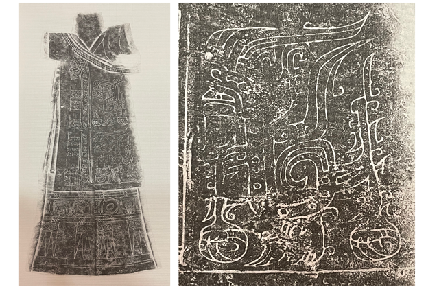 目前發(fā)現(xiàn)殷商時期綺的實物并不多,瑞典斯德哥爾摩遠(yuǎn)東古物博物館保存的商代銅鉞上發(fā)現(xiàn)的綺,是平紋地上顯菱形花紋的絲織品。此外,在瑞典馬爾莫博物館保存的銅觶(zhì)上,也發(fā)現(xiàn)有類似銅鉞上的斜向經(jīng)線組成的斜紋,推測為綺⑤。故宮博物院所藏商代玉戈、商代銅戈把上也發(fā)現(xiàn)綺的印痕⑥。河南安陽殷墟婦好墓出土的青銅偶方彝的絲織品印痕上,發(fā)現(xiàn)有回文圖案的綺,“其花紋與殷代造型人物形象上的衣飾和某些銅器上的局部花紋是相同的”⑦。
