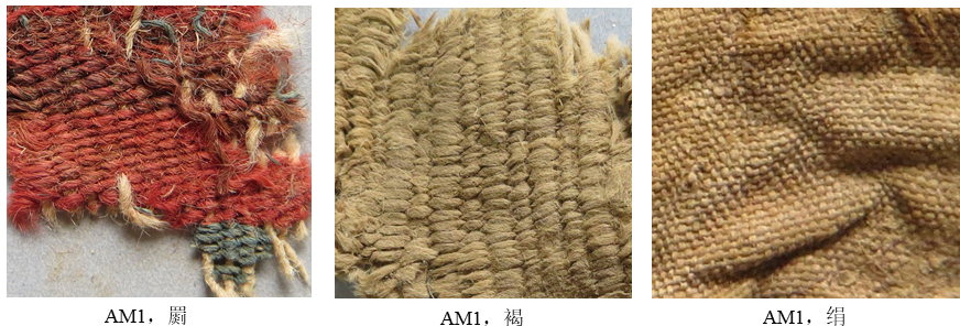 曲曼墓地出土的紡織品中,織物組織結(jié)構(gòu)主要以平紋為主(圖1),亦有少量毛氈、斜編織物。平紋織物交織點多,布面挺括,織物的斷裂強(qiáng)力大,耐磨性好,是實用性較強(qiáng)的一種組織結(jié)構(gòu)[1],曲曼墓地出土平紋織物主要以單色毛布為主。值得一提的是其中編號為AM1-12-2的標(biāo)本為平紋毛罽(圖1 左),色彩鮮艷,制作精良。罽即色織、帶有精細(xì)花紋的精細(xì)毛織物,許慎《說文》釋作“西胡毳布”,又稱毳即“獸細(xì)毛”。這件五彩斑斕的織物殘片充分展示了2500年前當(dāng)?shù)厝嗣竦目椩旒妓?,及對服飾藝術(shù)美的追求。