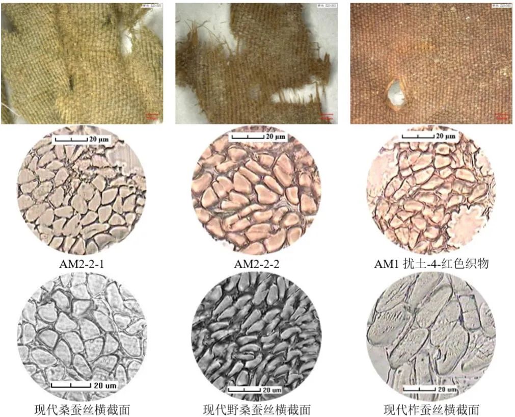 另有2組樣品為平紋絲織品,可稱之為絹,是古代中原地區(qū)最為常見的絲綢品種[2],且通過橫截面觀測對比,可以進(jìn)一步判斷曲曼墓地出土的絲纖維種類為桑蠶絲。(圖2)