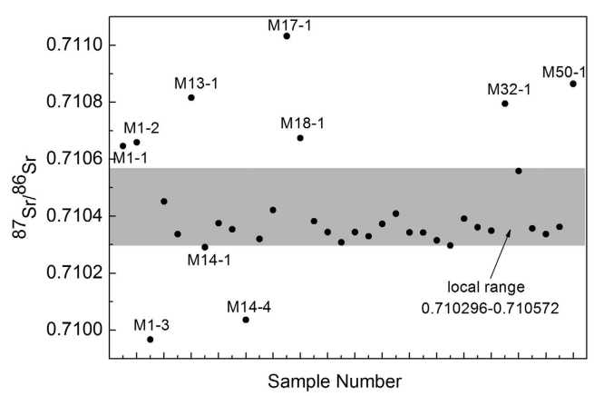 一般選擇伴人動物作為參照,因為伴人動物和人類攝入的食物比較相近,且與人類活動關(guān)系密切,業(yè)內(nèi)公認(rèn)的方式是通過伴人動物的87Sr/86Sr均值±2倍標(biāo)準(zhǔn)差,作為當(dāng)?shù)刂档姆秶?,在此研究中,以同墓群出土的羊骨作為參照對象,測得其當(dāng)?shù)刂档姆秶▓D3陰影區(qū)域)。待測樣本的87Sr/86Sr若在此范圍內(nèi)則為本地人口,超出這個范圍即為外來人口。
