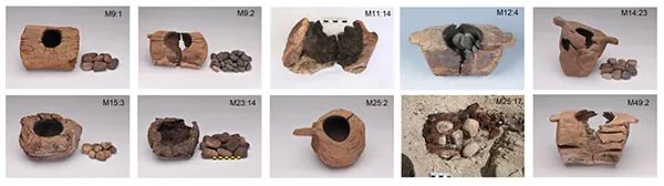 曲曼墓地出土的隨葬品中,有一種非常獨特的隨葬品——火壇(圖4)?;饓胁繄A形空穴被強(qiáng)烈燒灼碳化,外形完好無任何過火痕跡。燒灼由內(nèi)部15粒燒紅后放入的圓形石子所致,強(qiáng)烈灼燒的木火壇放入墓穴填土被埋后熄滅,這是歐亞大陸范圍內(nèi)迄今發(fā)現(xiàn)最早的明火入葬火壇。