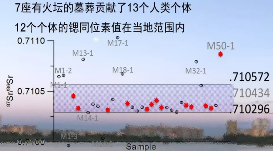 火壇、本地人口、外來人口,三者之間有何關(guān)聯(lián)?對此,唐自華團(tuán)隊又選取了7座有火壇的墓葬里的13具人骨測試鍶同位素值,以紅色點在圖3中標(biāo)示,形成圖5,我們可以發(fā)現(xiàn),除了右上角的M50之外,其他12具人骨鍶同位素值全部在當(dāng)?shù)胤秶鷥?nèi),即7座有火壇的墓葬里的13個人類個體,有12個個體鍶同位素值是在當(dāng)?shù)氐姆秶锩娴?。由此可以推測,火壇這種宗教用品,主要是由本土人使用。