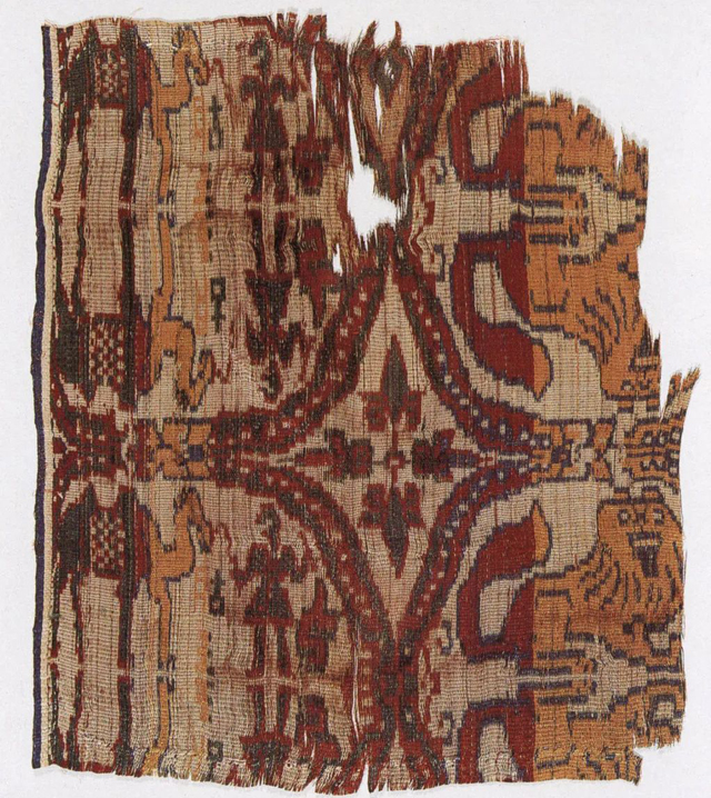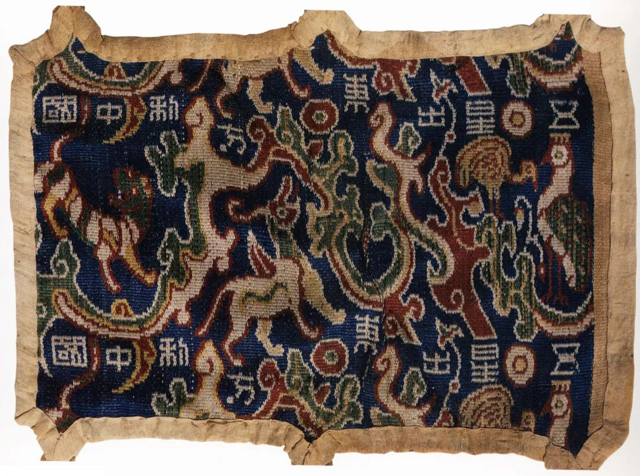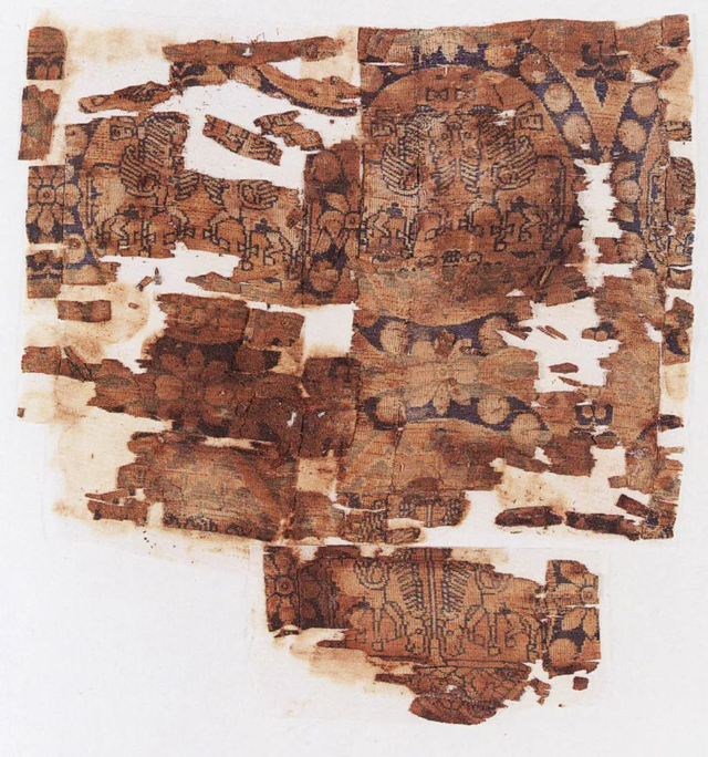“五星出東方利中國錦護臂”與同墓出土的“討南羌”銘文錦褲,其紋樣復原后合稱“五星出東方利中國討南羌”。紋樣右起依次有鳥、獨角獸、虎,以山狀云做骨架,云獸結(jié)合的紋樣形式由東漢延續(xù)至魏晉、北朝時期。這類形式的云獸紋錦在1-5世紀的中國、中亞、西亞的毛織物中都可以看到。