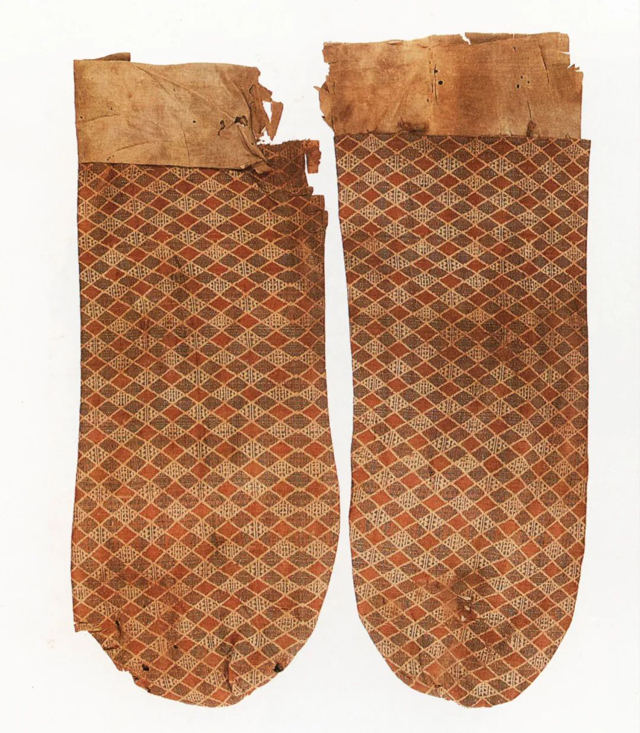菱紋“陽”字錦襪,紋樣為滿地菱紋,在織物幅邊有一行白色“陽”字和藍色四瓣花紋。簡潔的菱格紋是漢晉時期新疆地區(qū)的紋樣特色。