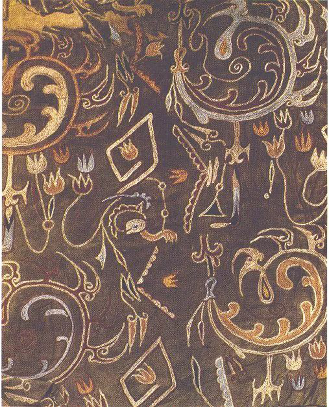 茱萸本是普通植物,古人認為可以辟邪。中國傳統(tǒng)節(jié)日九月九重陽有登高,佩茱萸以辟邪的習俗。茱萸三月開紅紫色花,七八月結(jié)果,果實成熟后開裂。在樓蘭、馬王堆、尼雅、營盤出土的織錦或刺繡中,都有相近的植物紋樣,其花枝卷曲,果實常作裂葉狀,其花有時呈蕾狀,有時則為三瓣狀。