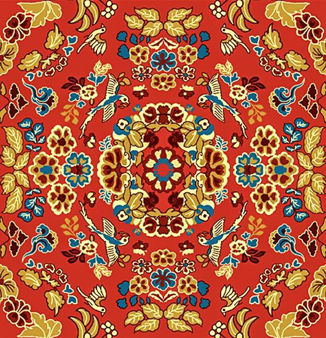 花鳥紋是唐代染織紋樣的重要題材。此作品以明艷紅色基調(diào)為主,以小面積的果綠、棕、海藍做對比色,在團花式的主體紋樣中,填充鳳鳥飛舞花枝的輔紋,紋樣的整體裝飾效果絢麗熱烈,正是一派“花舞大唐春”的華美景象。