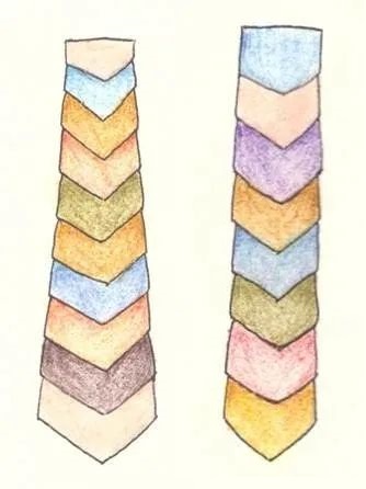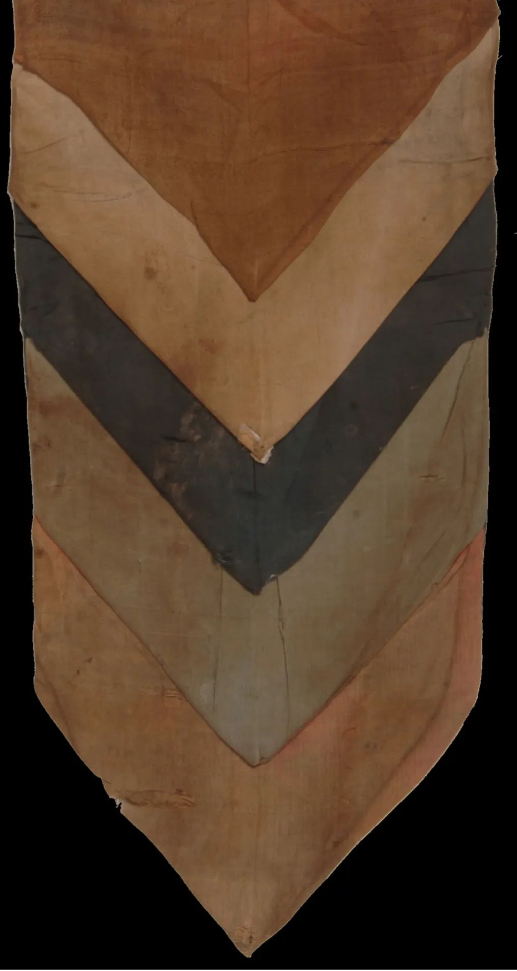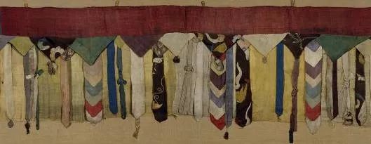 這類的垂帶正面是由不同顏色和質(zhì)地的絲織物一層層疊壓縫合而成的,類似魚鱗狀,背面多有一層絲織物作為襯墊。這些垂帶由絲綢零料拼合成,或上下同寬,或從上到下由窄至寬逐漸遞增,最終形成一條長寬尺寸較為統(tǒng)一的彩色長帶(如圖5)。英國維多利亞阿伯特博物館中有8件鱗形垂帶藏品(L.S.622:1-6,L.S.601,L.S.666)[4],旅順博物館中也有4件(20.1288,20.1282,20.1281,20.1314)。