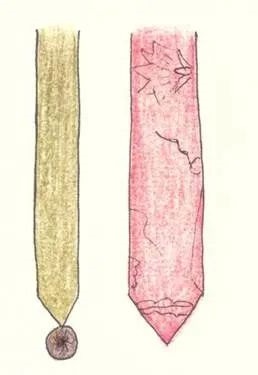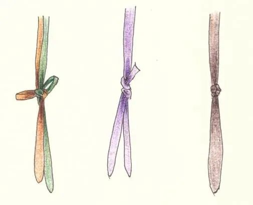 由一條及以上的不同面料通過系結(jié)的方式固定在一起,系結(jié)部位多在中間,系結(jié)方式根據(jù)織物數(shù)量的不同而略有區(qū)別。有的單根垂帶在中部系結(jié),有兩根及以上的,又分為單色和雙色條帶系結(jié)兩種(如圖4)。長度32-43厘米不等,寬度基本相同,約為1.8厘米。