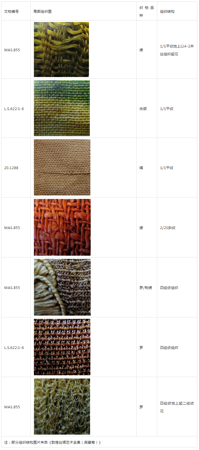 多數(shù)垂帶都是由兩塊及以上的布料拼縫而成,其品種較多,組織結(jié)構(gòu)各異。將現(xiàn)已發(fā)現(xiàn)的英國兩地所藏和旅順?biāo)囟鼗痛箮У目椢锲贩N進(jìn)行統(tǒng)計(jì)分析可知[5],平紋絹織物在每件垂帶上均可見,顏色豐富,經(jīng)緯線密度有差異,是主要的制作面料。綾、綺、羅等品種也常有出現(xiàn),其中羅織物又分為素羅、花羅等,足見其品種之豐富。選擇有代表性的織物品種分類羅列如下表(見表2):