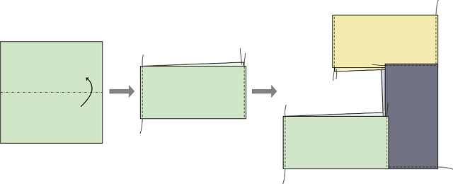 該件文物的制作方法和一般飄帶層層重疊縫合的方式不同,從其殘剩的歷史信息可知,其主體應(yīng)該是由多塊形狀大小一樣的布料通過折疊、拼接、縫合等方式制作而成。通過測(cè)量可知,主體的每單片織物均為邊長約是13cm的正方形,通過中心對(duì)稱折疊后縫合其中的一邊,另一邊則在開口處新加一片同樣大小的異色面料后再繼續(xù)縫合。這樣幾次循環(huán)下去后,就形成了一個(gè)類似環(huán)狀的拼合體(圖11)。最后在其內(nèi)沿一圈縫合上和主體同長等寬的藍(lán)色襯布,再通過折疊、翻轉(zhuǎn)等方式,形成最終形制(圖12)。