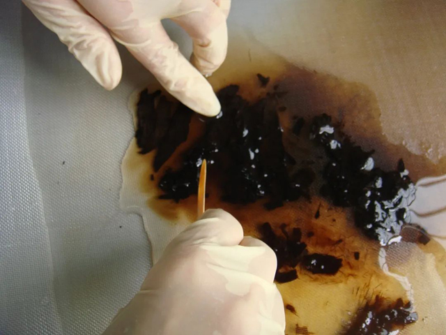 南宋史嵩之墓位于浙江省余姚河姆渡五聯(lián)村,2012年在墓葬中出土了大量絲織品,該批絲織品數(shù)量大、規(guī)格高、種類豐富,囊括了當(dāng)時(shí)流行的所有品類,部分織物在浙江省甚至世界范圍內(nèi)是首次發(fā)現(xiàn)。由于埋藏環(huán)境的影響,絲織品都粘連在一起(圖1),看上去完好,但若馬上揭取會(huì)導(dǎo)致纖維斷裂,織物損壞如爛泥狀(圖2)。為搶救這批珍貴的南宋絲織品,工作人員將其整體提取并送至紡織品文物保護(hù)國(guó)家文物局重點(diǎn)科研基地(中國(guó)絲綢博物館)進(jìn)行提取保護(hù)?;诮z織品文物的保存現(xiàn)狀,專家采用自主研發(fā)的絲蛋白加固技術(shù)對(duì)飽水絲織品進(jìn)行加固保護(hù)后再揭取(圖3)。先通過(guò)小樣實(shí)驗(yàn)遴選加固工藝,對(duì)加固前后絲織品的機(jī)械性能、外觀形貌、熱穩(wěn)定性進(jìn)行檢測(cè),接著利用優(yōu)化的絲蛋白加固工藝,對(duì)文物進(jìn)行整體加固并揭取,成功揭取文物四千多片,這為后續(xù)絲織品服飾的復(fù)原提供了實(shí)物基礎(chǔ)。2018年距絲蛋白加固技術(shù)在史嵩之文物上的應(yīng)用已有六年,我們采用掃描電鏡、熱重分析和氨基酸分析等檢測(cè)手段對(duì)絲蛋白加固效果進(jìn)行追蹤。