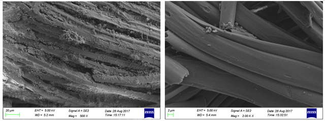 保存六年后的文物原樣和加固樣的纖維形貌見(jiàn)圖4。從左圖中可以看出文物原樣纖維表面仍舊附著著大量的污染物,纖維間的空隙被污染物填滿,固結(jié)的污染物會(huì)使纖維硬化和脆化。右圖為加固后絲織品的表面形貌,纖維表面光滑,排列緊密,纖維的保存狀況明顯優(yōu)于未加固樣。