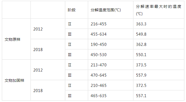 表1為2012年和2018年絲織品文物原樣和加固樣的熱失重比較,可以發(fā)現(xiàn),六年時(shí)間分解溫度變化不顯著。說(shuō)明在一個(gè)穩(wěn)定的保存環(huán)境中,文物的老化速率會(huì)降低,同時(shí)也表明絲蛋白加固不僅改善了絲織品的保存狀態(tài)而且不會(huì)加速絲織品的老化。