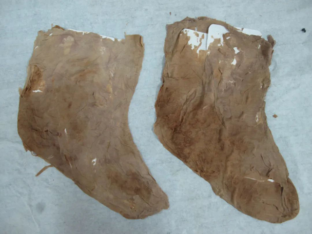 此外,絲蛋白加固技術(shù)還在遼代黃地飛鷺卷云團(tuán)花紋錦(2009)、新疆吐魯番阿斯塔納出土唐代米色絹襪(2012)、紫褐色羅印金彩繪花邊單衣(2016)等不同的場(chǎng)景下進(jìn)行了應(yīng)用,我們也對(duì)其加固效果也進(jìn)行了跟蹤。圖5為阿斯塔納出土唐代米色絹襪,加固前絹襪整體呈糟朽狀,無(wú)法直接采用針線修復(fù)。采用絲蛋白加固后絹襪應(yīng)力應(yīng)變性能改善,經(jīng)針線修復(fù)后對(duì)其形制進(jìn)行復(fù)原,五年后絹襪的保存狀態(tài)良好。