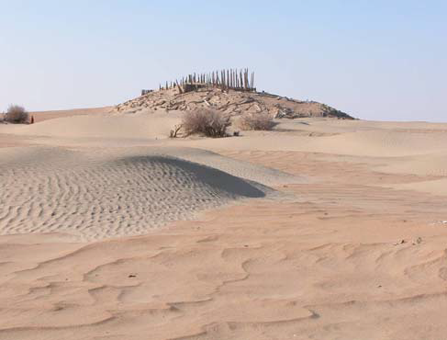 小河墓地整體由數(shù)層上下疊壓的墓葬及其它遺存構(gòu)成,外觀為在比較平緩的沙漠中突兀而起的一個橢圓形沙山。該沙丘是在一座原生的高阜沙丘的基礎(chǔ)上,由不斷構(gòu)筑的多層墓葬以及自然積沙疊壘、堆積而成,由木柵墻分為南區(qū)和北區(qū),其中南區(qū)保存較好,處于迎風(fēng)面的北區(qū)由于風(fēng)蝕保存較差。小河墓地可分上下五層,其中距今3700~3500年的第一、二、三層和距今4000~3700年的第四、五層及北區(qū)分別呈現(xiàn)出兩種不同的文化特征。
