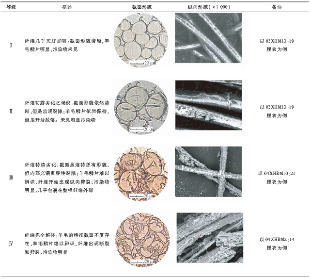 對125個纖維截面圖片進(jìn)行形貌研究,發(fā)現(xiàn)可將之大致分成4類,分別對應(yīng)羊毛纖維的4個劣化階段或劣化等級(表1)。對125個纖維截面圖片進(jìn)行統(tǒng)計,可知隨著地層的加深,年代趨于久遠(yuǎn),纖維污染隨之加重,纖維劣化隨之顯著。各個地層中的纖維劣化等級分布,可知第一、二、三層的55個測試結(jié)果中,第Ⅰ階段為64%,第Ⅱ階段為29%,第Ⅲ階段為7%,未見第Ⅳ階段,可見毛纖維保存狀況非常完好。第四、五層和北區(qū)的73個測試結(jié)果中,第Ⅰ階段為12%,第Ⅱ階段為25%,第Ⅲ階段為11%,第Ⅳ階段52%,可見毛纖維已經(jīng)發(fā)生了比較嚴(yán)重的劣化。