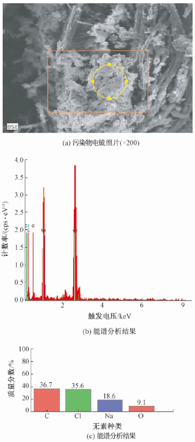 采用臺式掃描電子顯微鏡和能譜儀(Quantax70,Bruker)對污染物進(jìn)行元素成分分析,可知氯化鈉(NaCl)是污染物的主要成分。