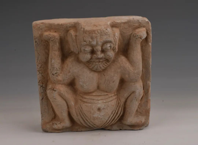 此次展出的一件畫像磚中的形象為托梁力士。力士作雙手舉起托梁狀。額頭處上有一對小尖角,臉部現(xiàn)出用力的神態(tài),雙目緊鎖、暴凸,鼻翼鼓張,呲嘴露牙,須毛怒發(fā),表情生動。上身裸露,胸前的肌肉發(fā)達。穿緊身褲,顯出深凹的臍眼。雙腿作蹲踞狀。