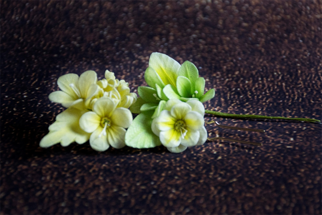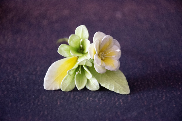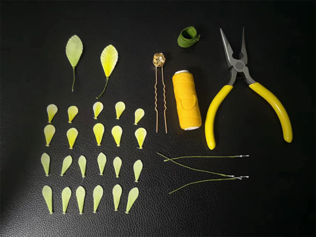 要用絲網(wǎng)制成精巧的花卉,不僅要學(xué)習(xí)扎、捏、纏、綁等技法,還要層疊組合各種花瓣。在制作出兩片顏色不同、大小不同的葉片后,每個(gè)學(xué)員手中都慢慢呈現(xiàn)出花的雛形。每一種花卉都有不同的特性,先要完成花的雛形;再根據(jù)花卉原本的自然形態(tài)進(jìn)行塑形;最后把塑形過后的花朵調(diào)整組合在一起,安插在發(fā)釵、發(fā)簪的底座上就完成了。