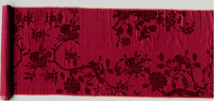 清代福壽牡丹桃花紋漳緞袍料是一件長(zhǎng)袍所用的面料,它按長(zhǎng)袍的形制、尺寸設(shè)計(jì)和布局圖案,只要按此織料上的服裝外形裁剪并縫制,便可成一件長(zhǎng)袍,因此,也稱(chēng)織成袍料?!墩f(shuō)文解字》段注所云:“織成”乃“織而成之,不待剪裁之物”,指的就是這類(lèi)按服用所需而設(shè)計(jì)的織物??棾傻钠鹪春茉纾?964年新疆吐魯番阿斯塔那北區(qū)39號(hào)墓出土的東晉 “富且昌宜侯王天延命長(zhǎng)”銘文織成履,即為其中一例。明定陵也有龍袍織成料出土。故宮博物院則更有較多的清代織成龍袍袍料以及衣料的收藏。
