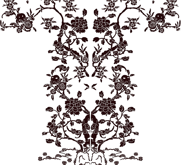 袍料的圖案猶如一幅風(fēng)景畫(huà):一片山坡上開(kāi)滿(mǎn)了小花,幾座壽山石的假山依坡而立,一整枝的牡丹樹(shù)上盛開(kāi)著花兒,與之纏繞的一枝桃樹(shù)上結(jié)著桃果和團(tuán)“壽”字樣的桃壽,蝙蝠在其中穿枝飛舞...... 這是一組典型的吉祥紋樣,牡丹連根整枝花,寓意“富貴根基”;牡丹和桃子(桃花),寓意“富貴長(zhǎng)命”;而壽山石、牡丹、桃子、蝙蝠一起,則寓意著“富貴長(zhǎng)壽多?!?。