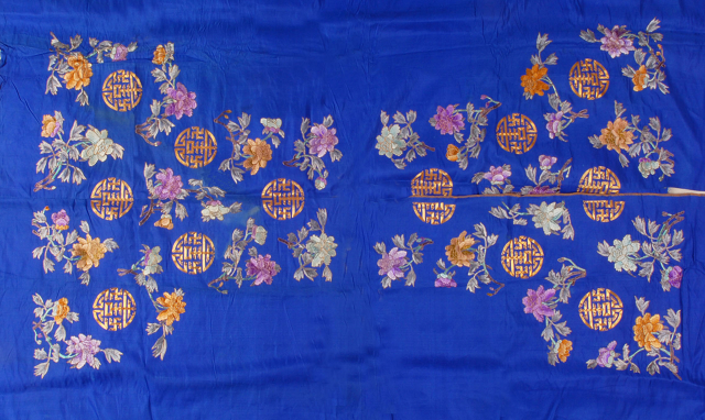 織成衣料在晚清時(shí)比較多見(jiàn),中國(guó)絲綢博物館收藏的清代刺繡花卉團(tuán)壽紋馬甲衣料,亦為其中一件。寶藍(lán)色的綢地上以彩色絲線繡出折枝牡丹花,用盤(pán)金繡繡出團(tuán)壽紋,富貴長(zhǎng)命是人們不朽的追求,馬甲的形制一目了然。